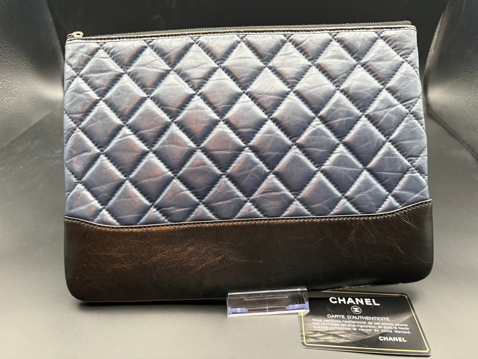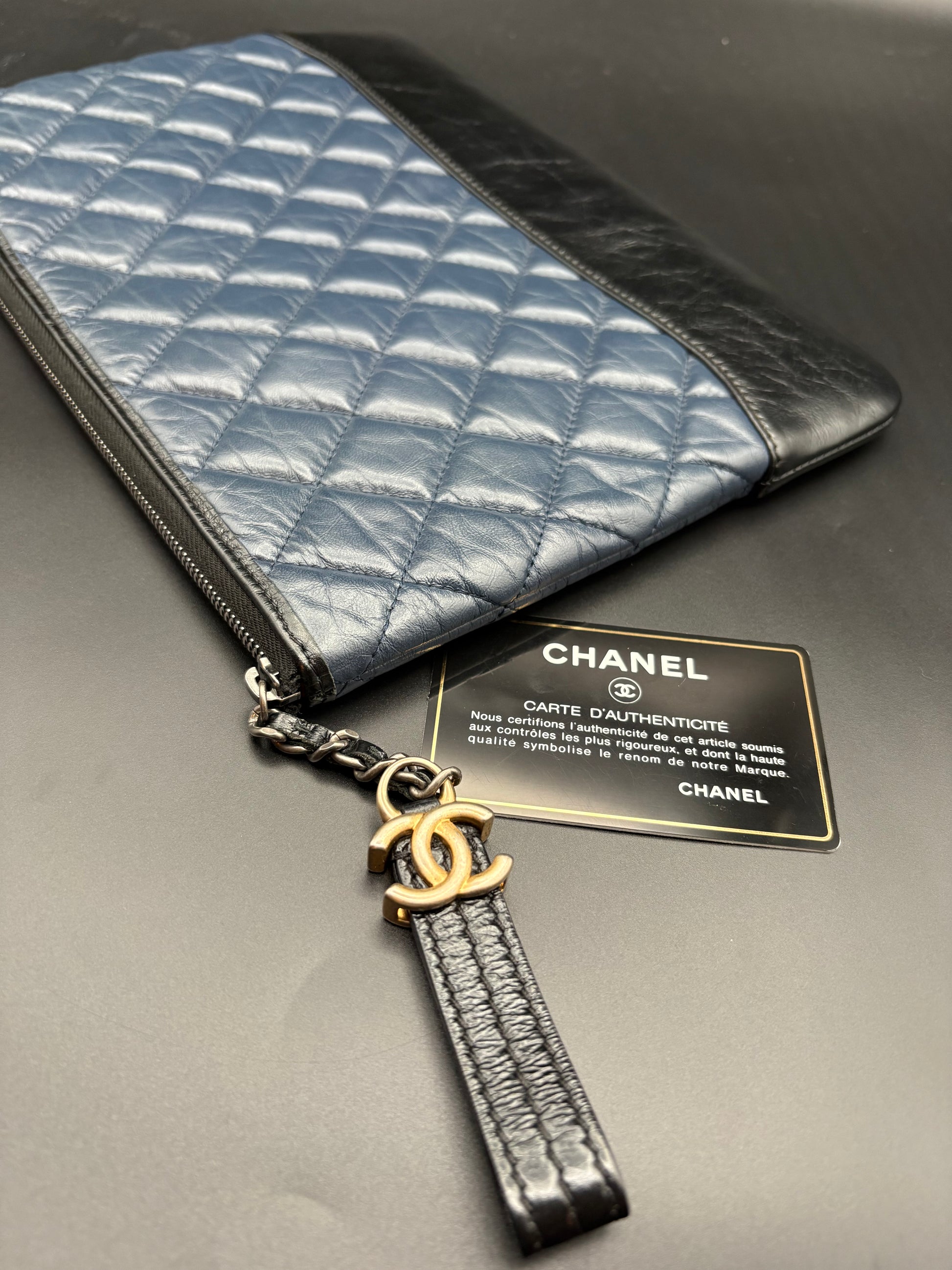 A refined Chanel quilted leather clutch that bridges casual and polished. The navy quilted leather pairs with a contrasting black leather base for quiet texture and depth. Clean lines and streamlined hardware make it an easy piece to carry on its own or slip inside a larger tote.