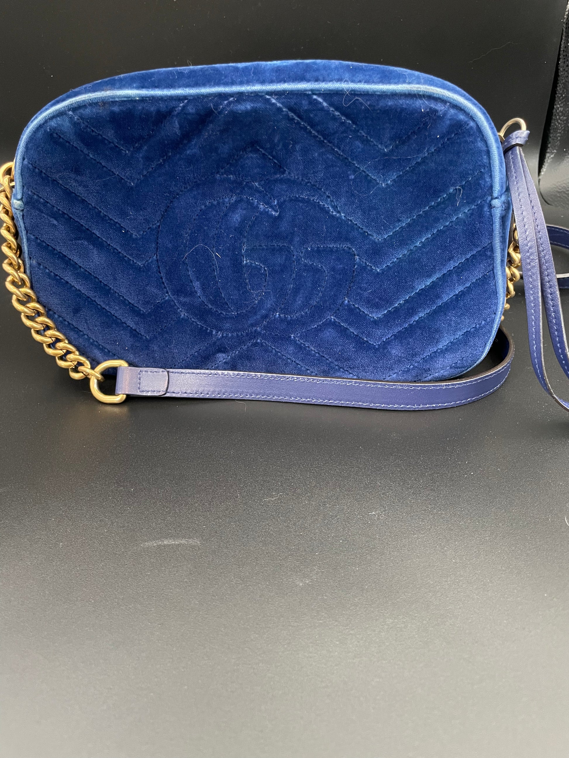 A plush take on the iconic GG Marmont, this camera bag comes in deep blue velour with chevron quilting and gold hardware. Trimmed with tonal leather, it offers softness and structure in a compact silhouette.