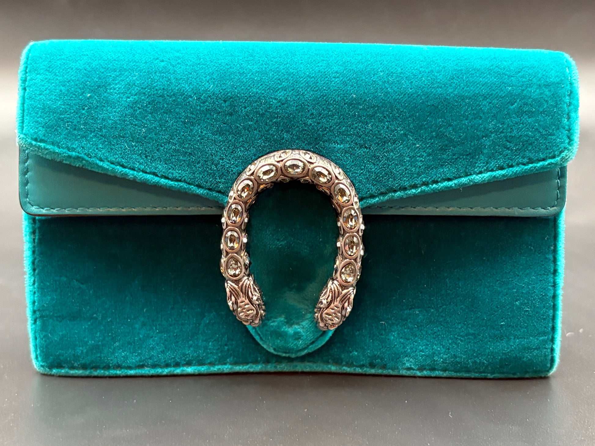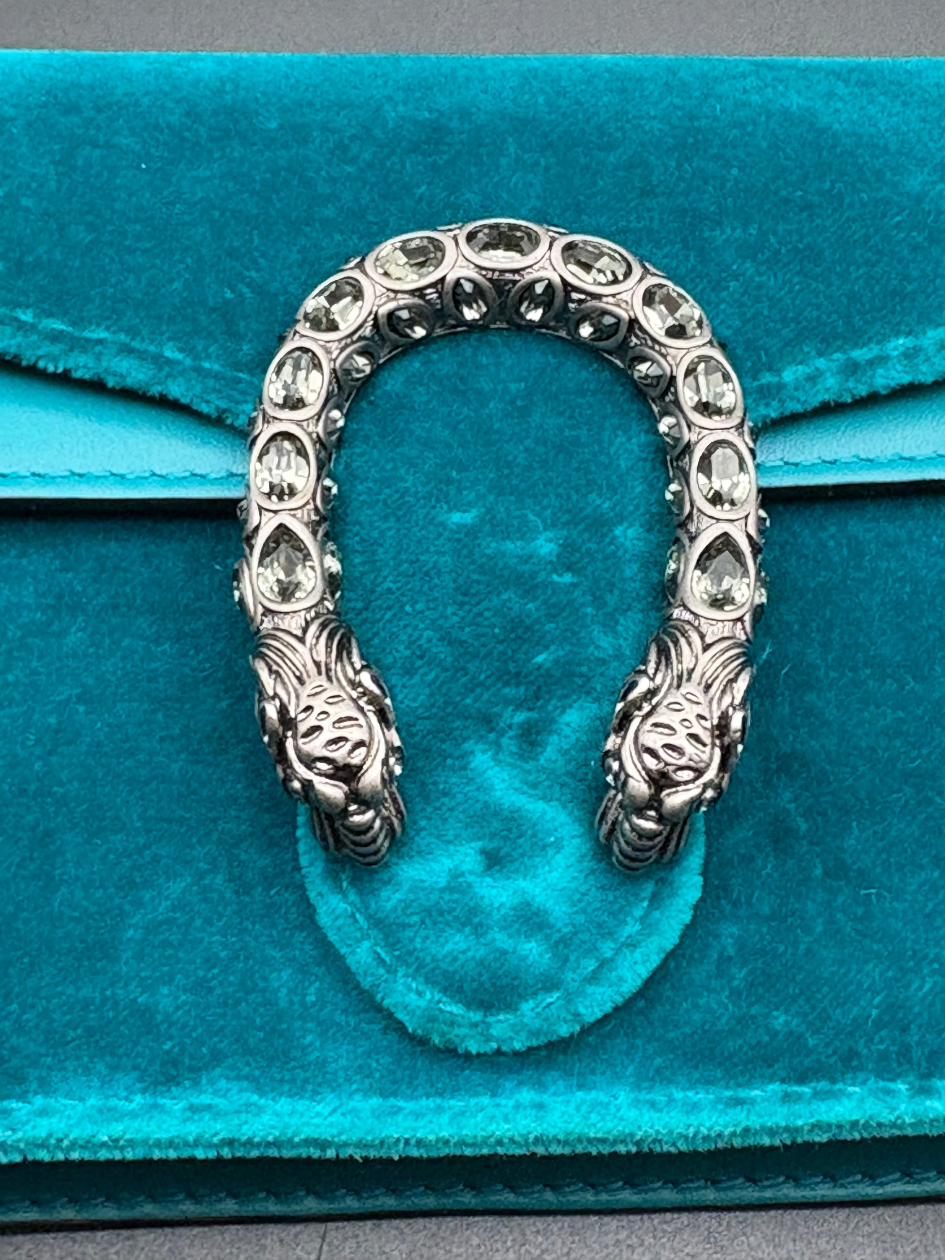 The Gucci Super Mini Dionysus bag in rich velvet, finished with the house’s signature antiqued silver-tone spur closure. Compact yet distinctive, this style is designed for light carry—ideal for essentials only—while the velvet adds depth and texture that sets it apart from the classic leather versions. The perfect gem tone makes it ideal for festive occasions.